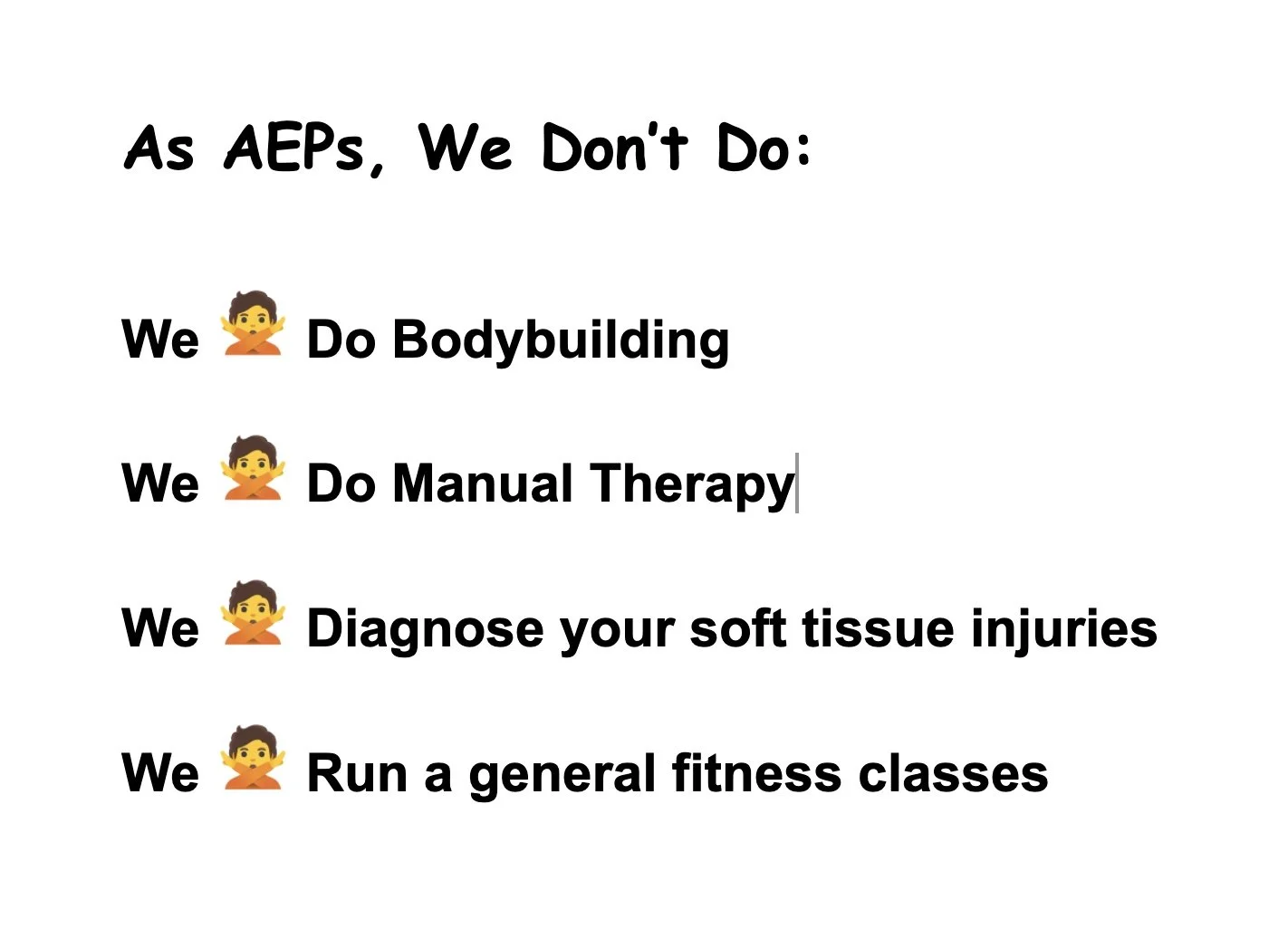 Exercise isn’t just about reps and sets—it’s about understanding your body and building the body-mind connection and long-term habits. AEPs spend a big chunk of their time educating clients on movement, injury prevention, and self-management strategies.